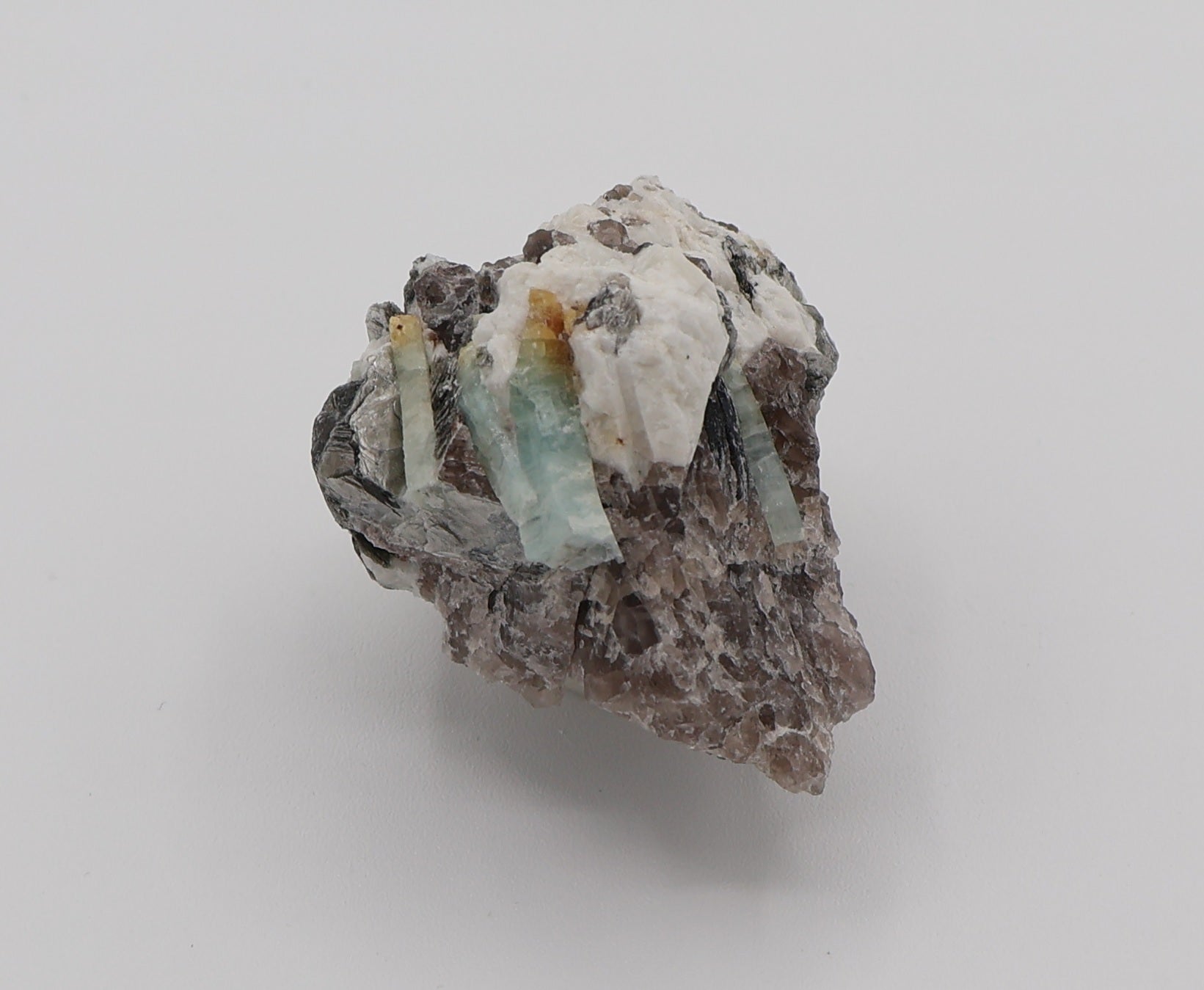 Heliodor Capped Aquamarine Cluster with Mica on Smoky Quartz and Feldspar