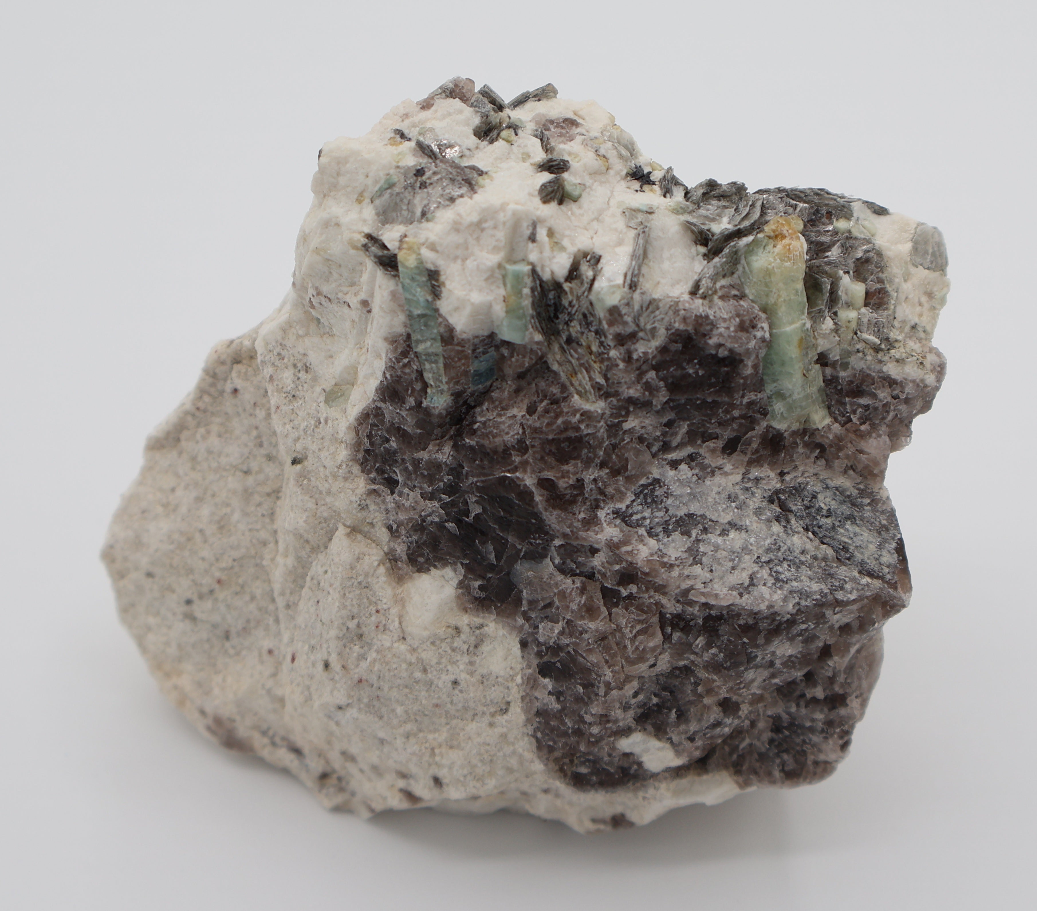 Heliodor Capped Aquamarine with Mica on Smoky Quartz and Feldspar